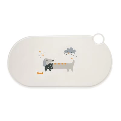 Alfombrilla para comederos, hecha de silicona apta para alimentos; protege el suelo; con borde elevado y ojal para colgar; bonito diseño con un teckel dibujado; tamaño: 50 x 25 x 3 cm (L x An x Al)