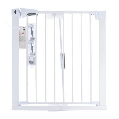 Barrera para perros, puerta bidireccional inteligente, cierre desde un ángulo < 90 °, instalación con o sin taladro, ampliable hasta 7 cm, para distancias de hasta 82 cm. Color blanco.