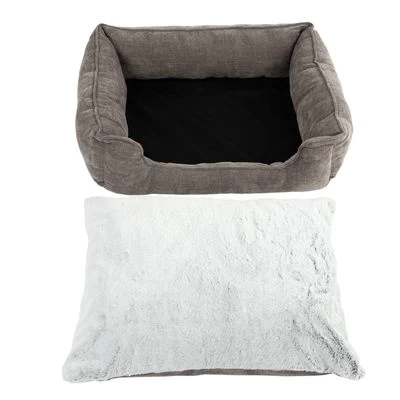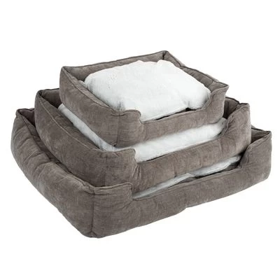 Cama para perros con borde elevado, entrada baja y cojín reversible. Relleno con copos de espuma viscoelástica para cuidar las articulaciones, con un lado de felpa y otro de tela de tapizado