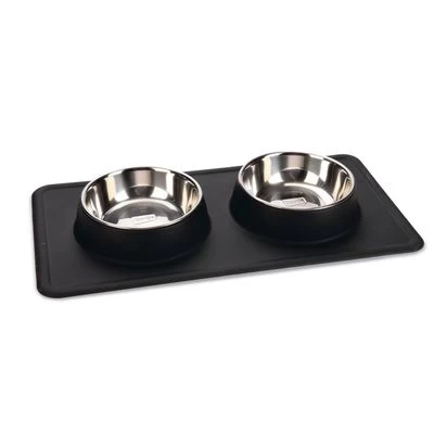 Este práctico set de comederos está compuesto por dos cuencos de acero inoxidable y una práctica base de silicona con borde ligeramente elevado que se puede limpiar fácilmente con agua tibia y un detergente suave (no lavar la base en el lavavajillas). Los dos cuencos son de acero inoxidable y se pueden extraer y lavar por separado en el lavavajillas.