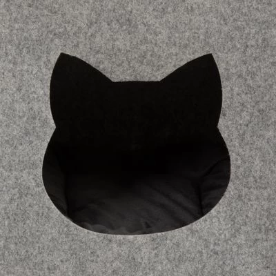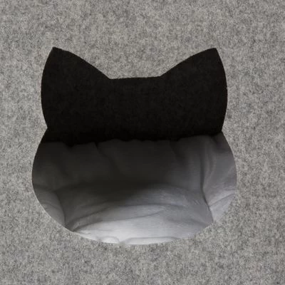 La entrada a esta cueva presenta la forma de la cabeza de un gatito, lo que da un toque de modernidad y originalidad a este accesorio. Además, la cueva viene equipada con un cojín bicolor en su interior para que el entorno sea todavía más acogedor. Este cojín reversible se puede lavar a una temperatura máxima de 30 °C. Uno de sus lados es de color gris oscuro mientras que el otro es de felpa blanca. Su relleno se compone de lana de poliéster, por lo que el confort dentro de esta preciosa cueva está más que garantizado.
