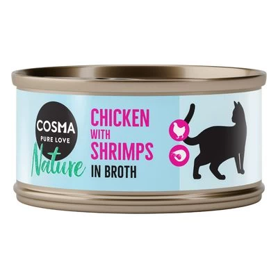 Cosma Nature es un alimento para gatos que destaca por su alto contenido de carne, un 75 %. Las distintas combinaciones con delicado atún, deliciosos filetes de pollo y salmón seleccionado, también combinado con gambas, garantizan que la alimentación de tu gato sea mucho más variada. Todos los ingredientes de Cosma Nature se cocinan en su propio jugo para que el sabor original de sus ingredientes se conserve intacto. Tu gato disfrutará de una experiencia culinaria muy suculenta.