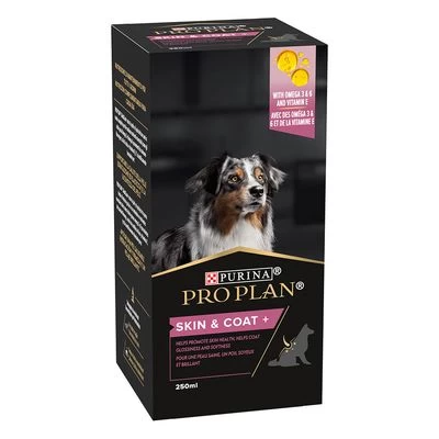 PRO PLAN Dog Supplement Skin & Coat ha sido desarrollado para favorecer la piel y el pelo de los perros. Contiene valiosos componentes: es una mezcla de aceites de salmón noruego, linaza y girasol. Aporta valiosos ácidos grasos omega 3 y omega 6, así como vitamina E. El producto no contiene azúcares añadidos ni colorantes y conservantes artificiales.